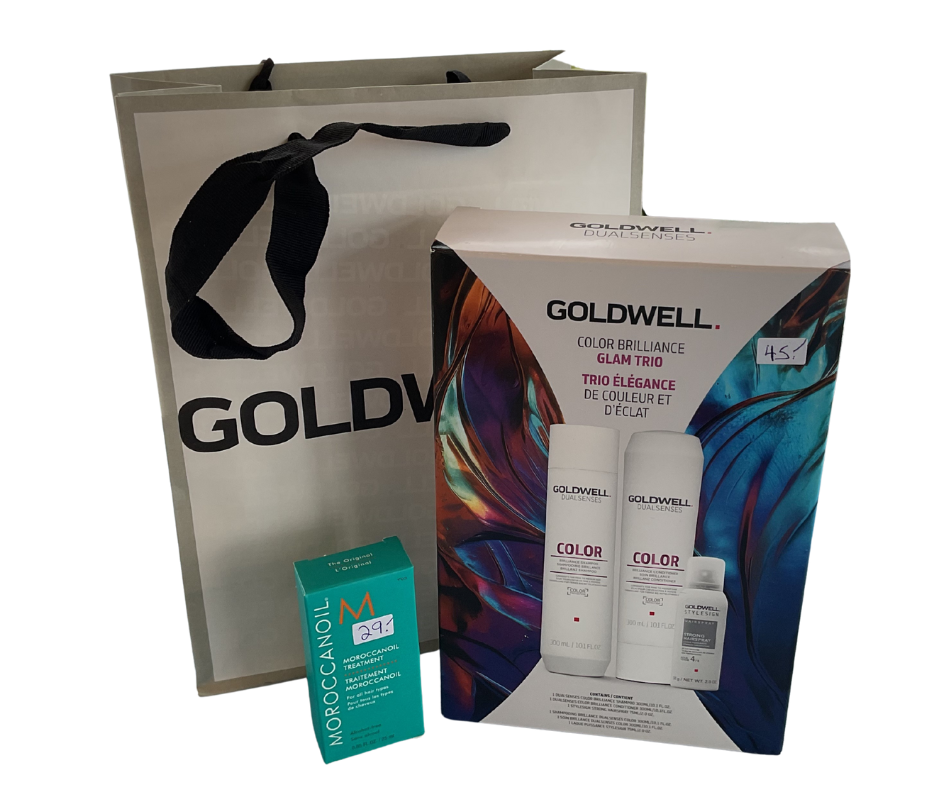 You never looked so good! This Colour Brilliance GLAM TRIO by Goldwell includes Shampoo, Conditioner & Hairspray and comes with another special product of Moroccan oil. Thank you Stephan, Owner of Hair Station at Sherwood Forest Mall, 1225 Wonderland Rd N.